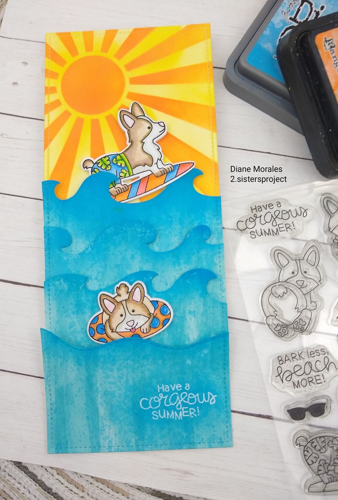 Diane used a Lawn Fawn Large Slimline With Sliders Die Set and a Newtons Nook Corgi Beach Clear Stamp Set and Coordinating Die Set